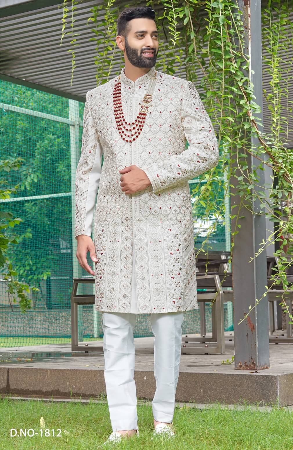 The sherwani is embellished with a combination of scallop-shaped and diamond motifs, densely embroidered in metallic thread, accented by red details for a pop of color.